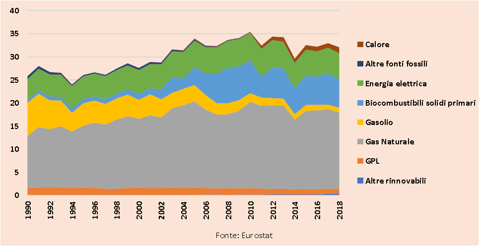 L’inquinamento dell’aria è principalmente causato dai processi di combustione e tra questi il peso maggiore è imputabile ai processi di riscaldamento degli edifici residenziali (le nostre case), e altri edifici utilizzati nelle nostre attività. Il riscaldamento degli edifici domestici e del terziario rappresentano quasi il 50% di tutti i consumi finali di energia. La figura a fianco mostra che circa il 25% di questi consumi è riconducibile all’uso della biomassa solida, della legna[5] Ma il particolato generato dalle combustioni non è proporzionale ai pesi dei singoli combustibili e vettori energetici. E’ difficile immaginare che quasi l’80% del particolato sia generato dall’uso della biomassa nei processi di combustione. Purtroppo è così. In altre parole se vogliamo ridurre il particolato nell’aria dobbiamo evitare di bruciare la biomassa solida in tutte le sue forme.