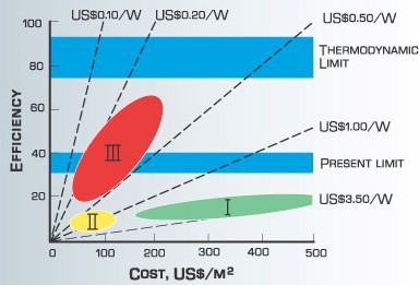 Costo ed efficienza potenziale delle tre generazioni di tecnologie fotovoltaiche
